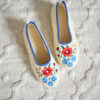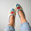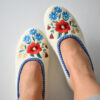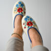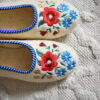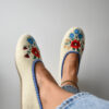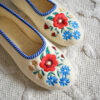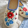 Stylish, comfortable and light slippers, made with raw, undyed wool felt in a natural cream colour and lined with extra layer soft wool. Decorated with a colourful embroidered flower motif.
