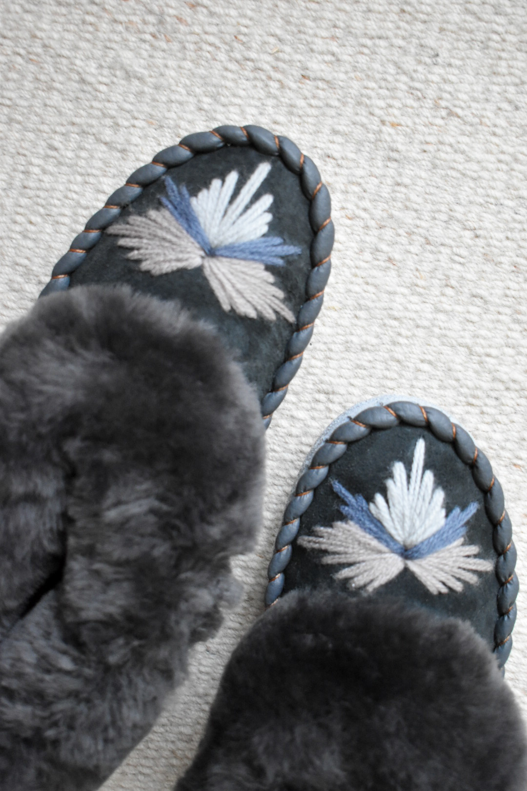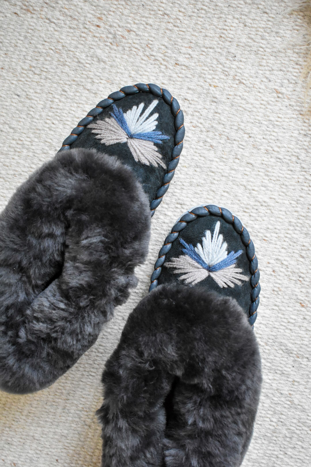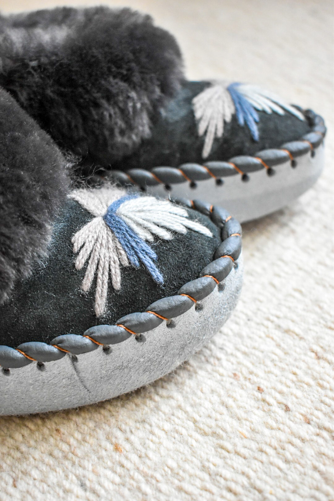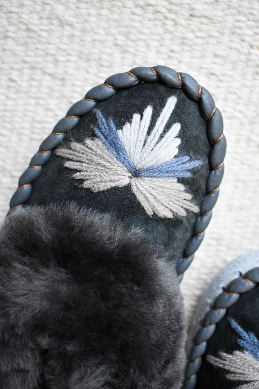 Small leather pieces and sheepskin leftovers are turned into beautiful and one of a kind home shoes.