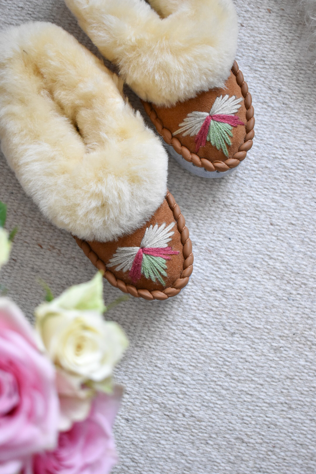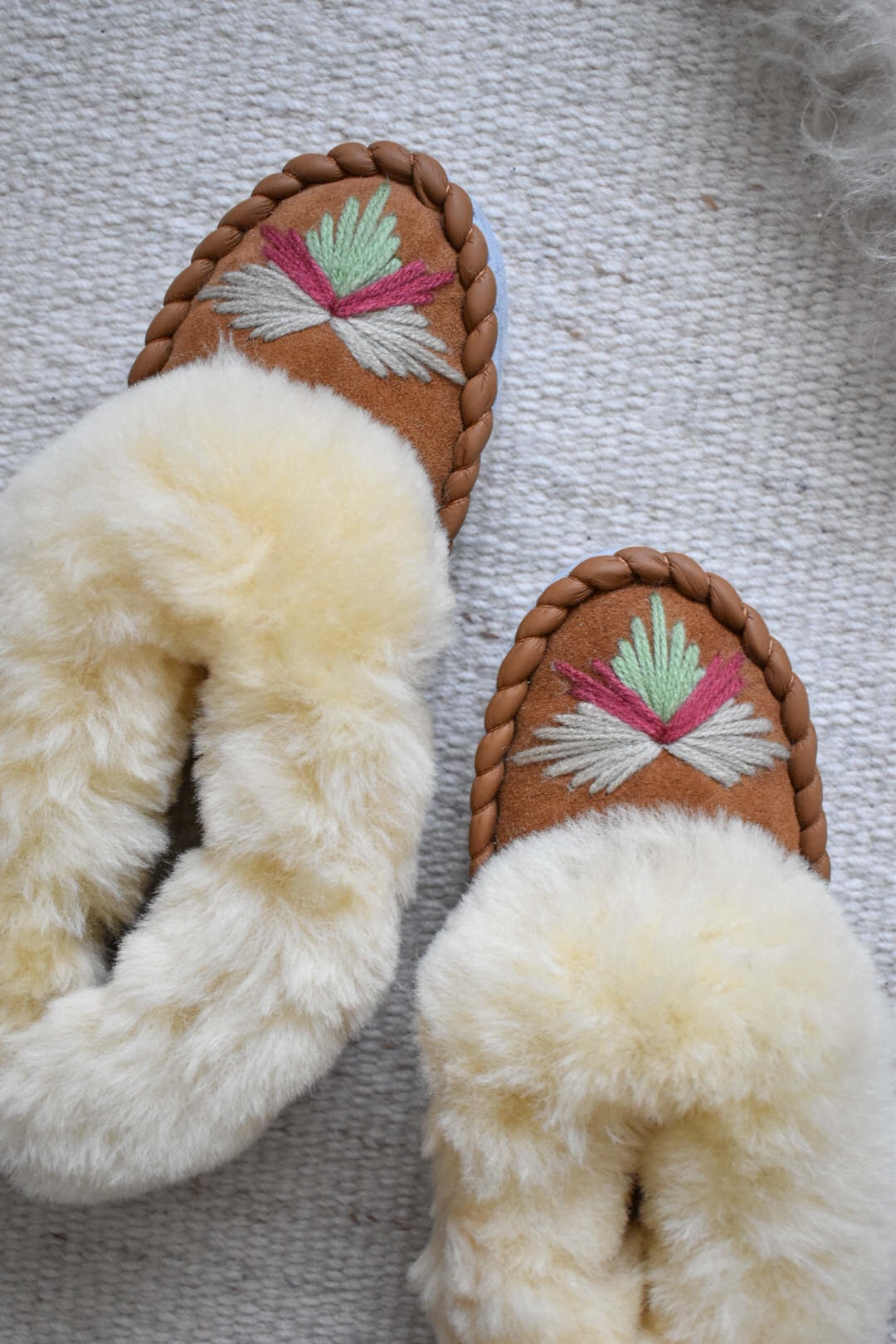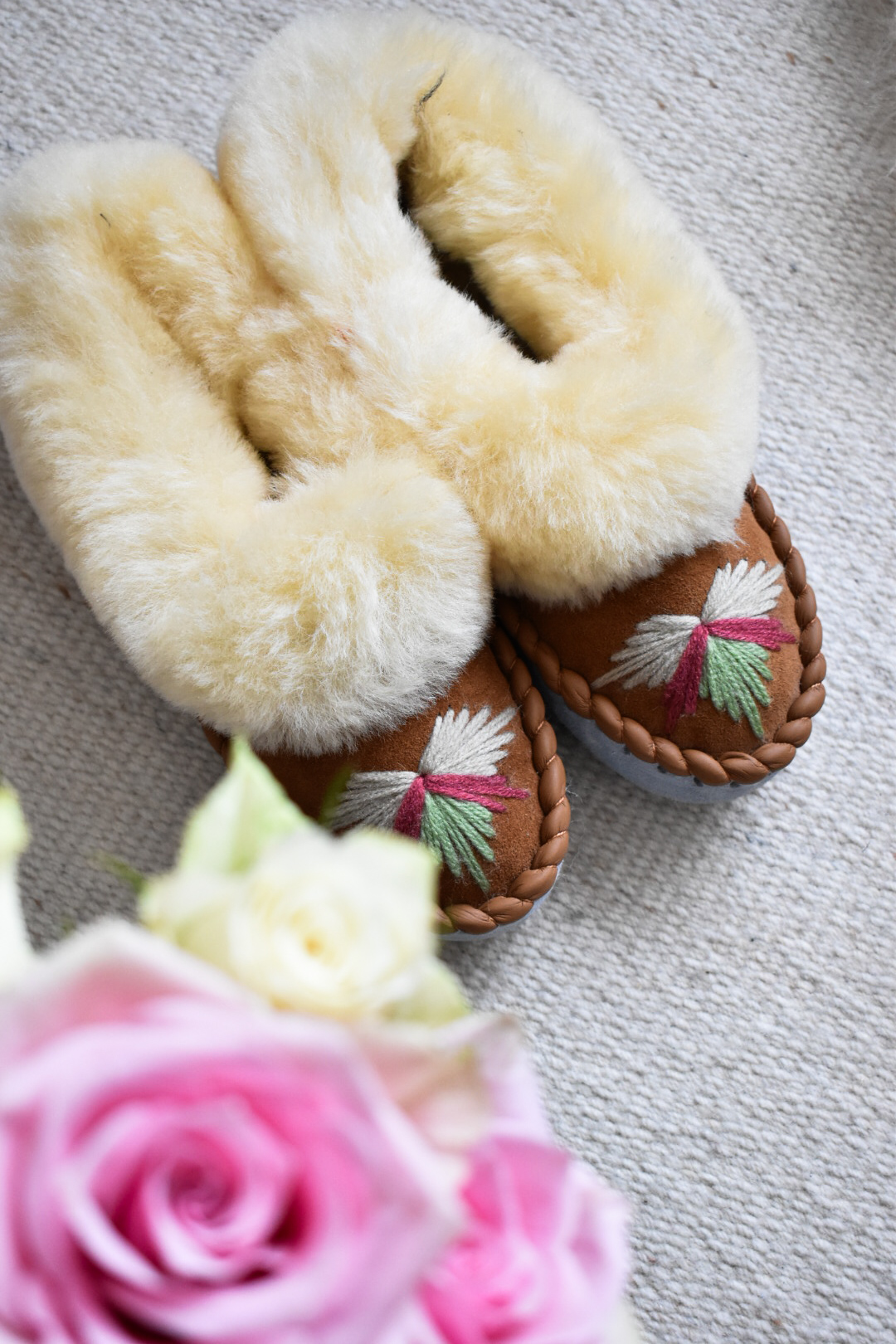 Small leather pieces and sheepskin leftovers are turned into beautiful and one of a kind home shoes.